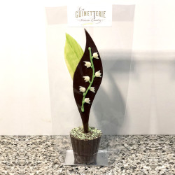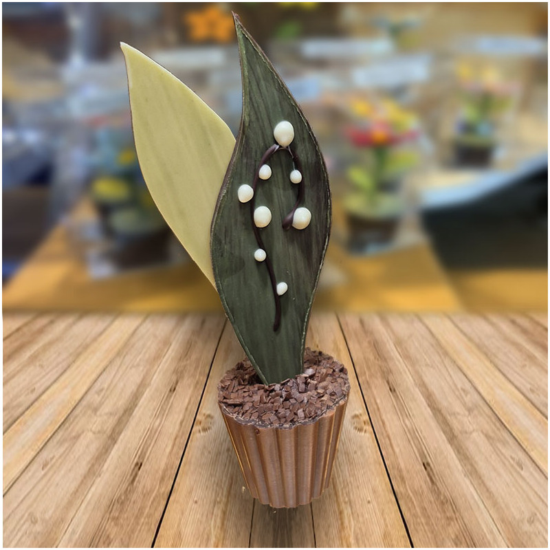 Pot en chocolat noir garni de praliné. Feuille en chocolat noir, brin en chocolat blanc. Feuille verte en chocolat Blanc.