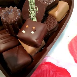 Coeur en chocolat noir rayé, garni de chocolats, Pralinés, ganaches, pâtes d'amande.